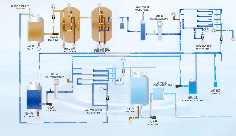適用于純凈水、礦泉水、果汁含氣飲料生產的各類水處理設備。主要包括:反滲透系統、鈉濾器、超濾器、微孔過濾器、多介質過濾器、活性碳過濾器、離子交換器、臭氧設備等等。